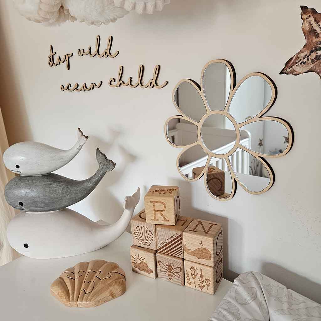 Let your little one's imagination blossom with the kids' flower mirror! This captivating mirror is ideal for adding a sprinkle of nature's beauty to their space and looks fab in any room, nursery, or even for tummy time! It's shatterproof and crafted from mirrored acrylic inset into a plywood frame.
