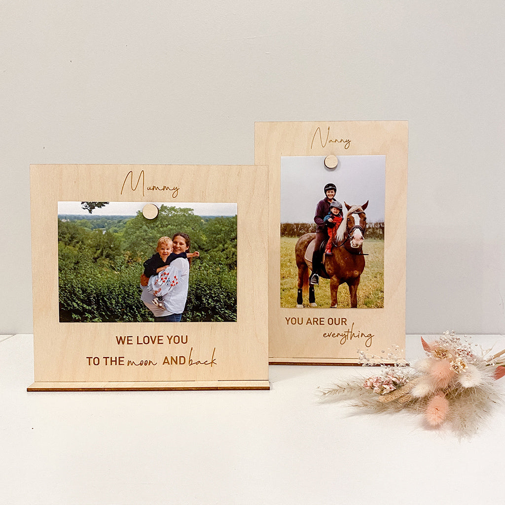 Freestanding Personalised Photo Frame designed to hold a 6x4in photo. It has a magnet to hold the photo in place and a wooden base for standing upright.