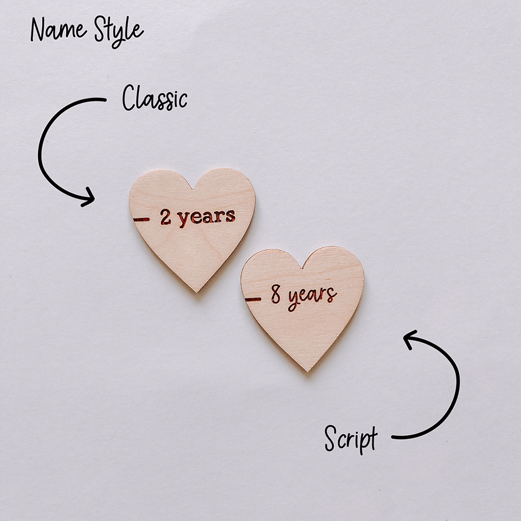 Add a heartfelt touch to your child’s height chart with our Personalised Heart Growth Markers – a charming and mess-free way to capture their milestones without marking the chart itself. Each wooden heart is engraved with your child’s age and designed to beautifully complement our matching personalised height charts (see other listings for styles).