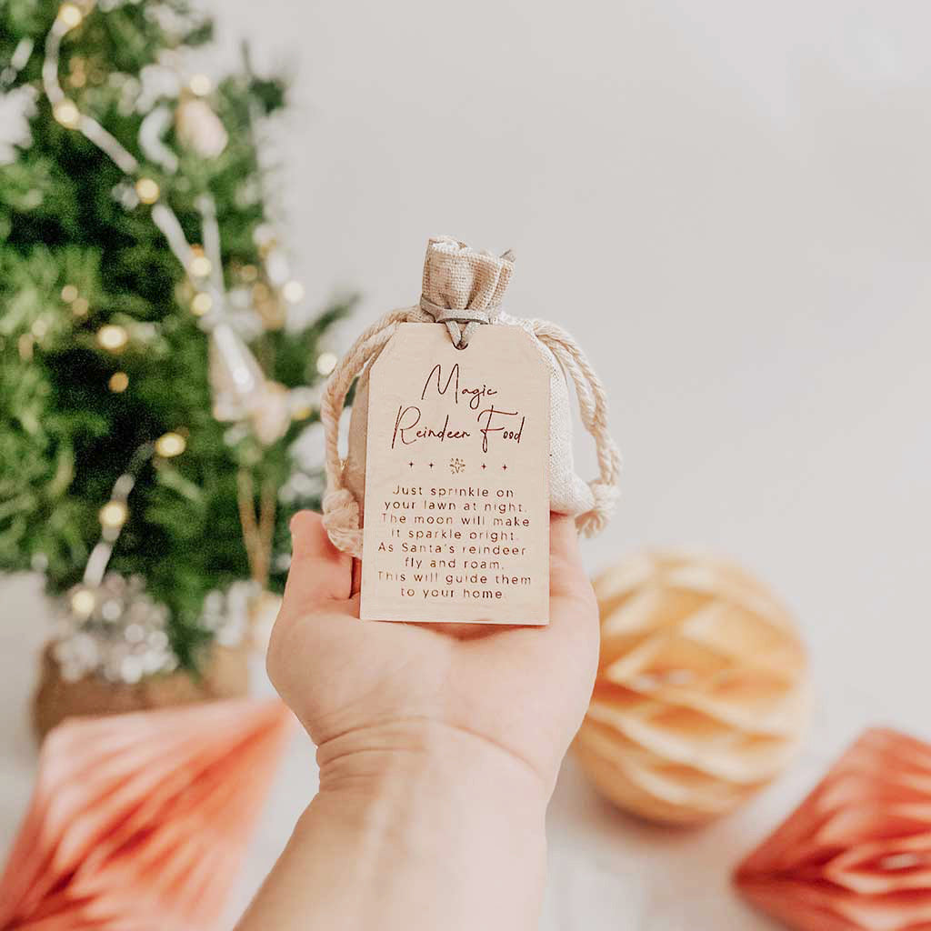 Make Christmas Eve even more special and magical with our personalised reindeer food. Each tag can be personalised with up to 3 names or a surname and comes tied with your choice of cord around an cotton drawstring bag.