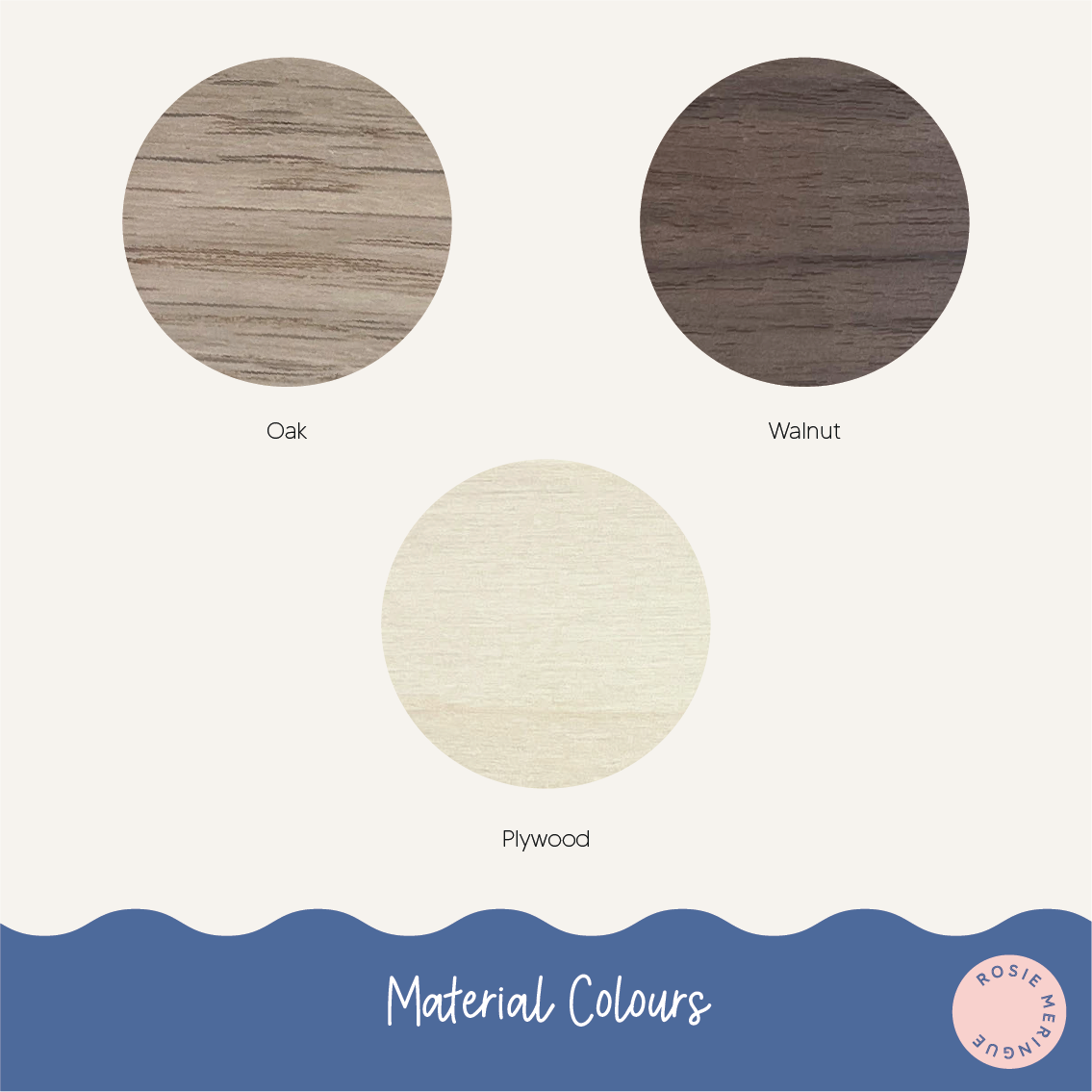 All our products are made from raw, unpainted, FSC-certified birch plywood, walnut veneer, oak veneer, birch veneer or acrylic. Every wooden item is beautifully sanded sides to ensure no burn marks are left on the surface. Please note the wood grain may vary from that shown in the pictures.