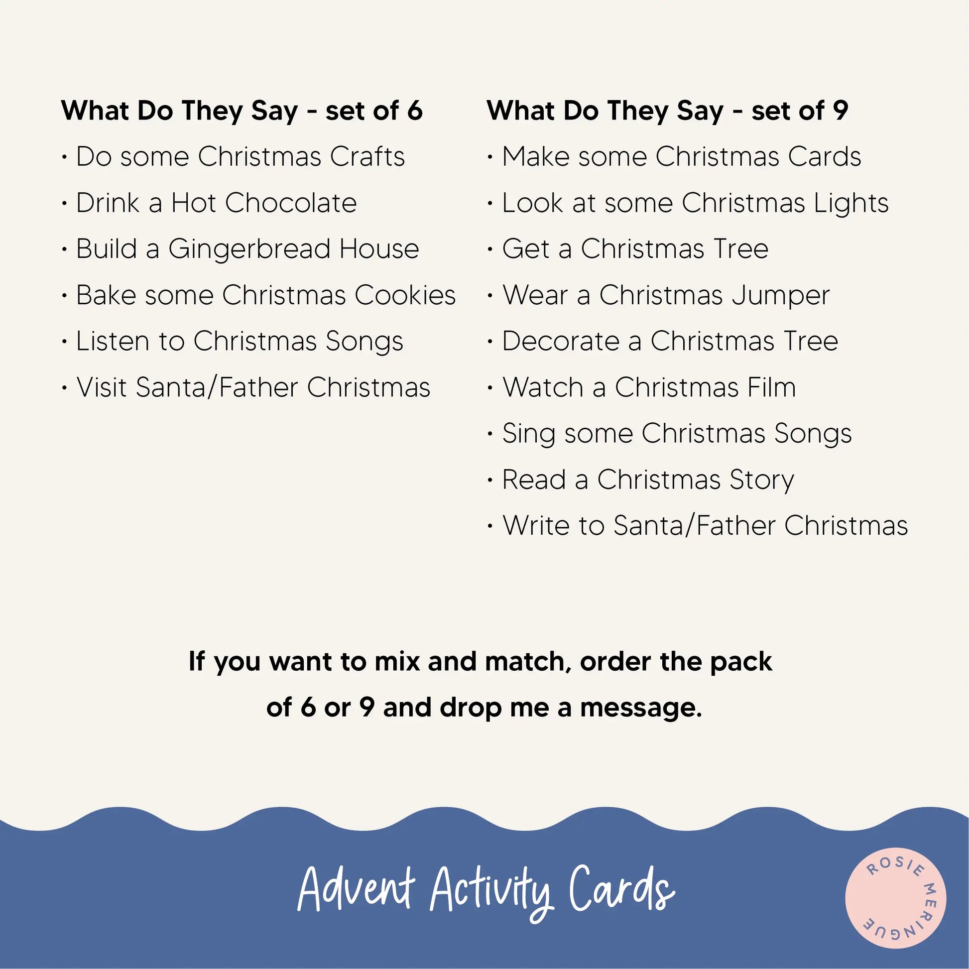 Do you have a reusable advent calendar and find it challenging to decide what to include each day, our activity cards are the ideal solution! They come with 9 or 6 different Christmas activities to be used year after year.